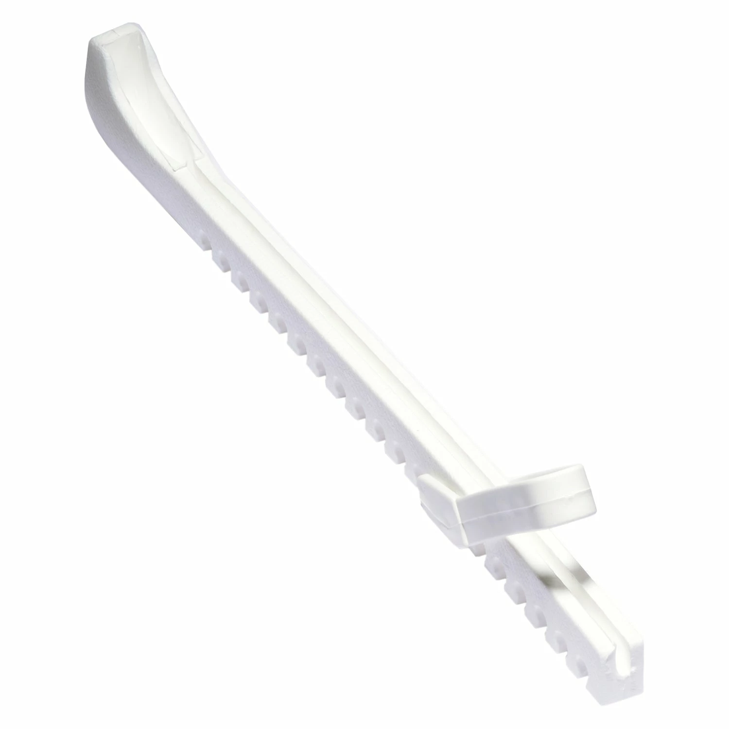 Befestigung: Die Schoner werden über die Kufen gesteckt. Der elastische Befestigungsring wird unter Zug über die Hinterseite der Kufen befestigt. Dieser kann durch die Zacken des Kufenschoners verstellt werden.