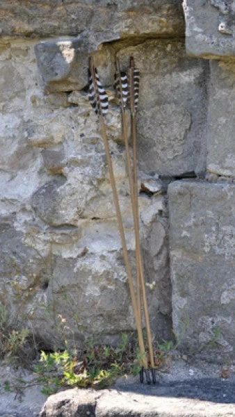 Ein traditioneller Komplettpfeil aus Holz mit Naturbefiederung.