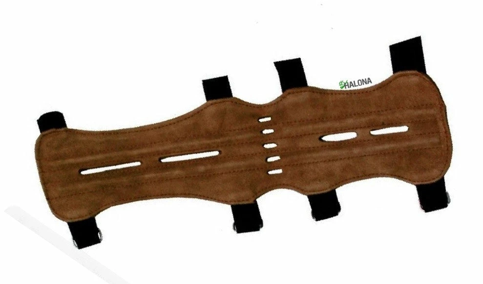 Langarmschutz mit einer Lederdeckschicht. Der Armschutz wurde mit Stabilisierungsstreben durchgezogen und mit Luftschlitzen ausgestattet. Aufgrund der langen Klettverschlüsse kann der Armschutz gut am Arm angepasst werden.