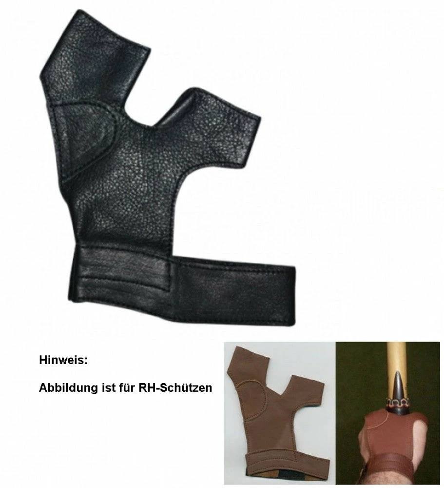 Der Handschuh wird an der rechten Hand getragen (Bogenhand) und ist somit für LH-Schützen gedacht. Der Handschuh aus weichem Leder hat zwei Fingerschlaufen (Daumen und Zeigefinger). Der Handrücken ist durch eine weitere Lederschicht verstärkt.