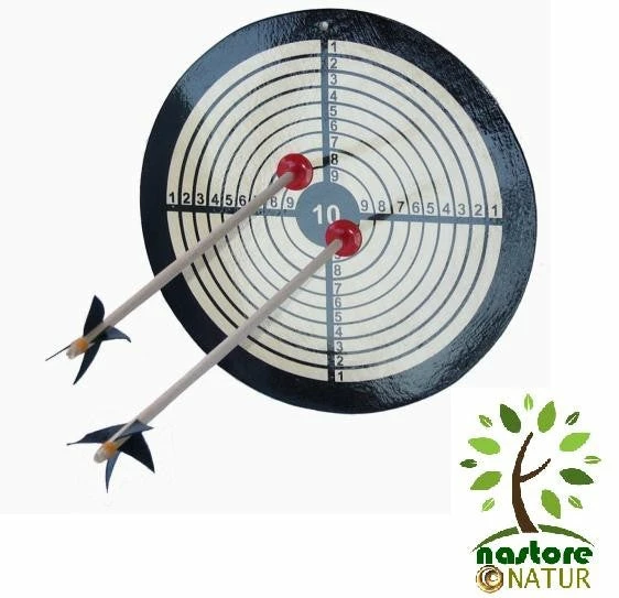 Das Grundmaterial ist Holz und wurde lackiert. Durch die Lackierung haften die Saugnäpfe der Pfeile besonders gut an der Oberfläche.