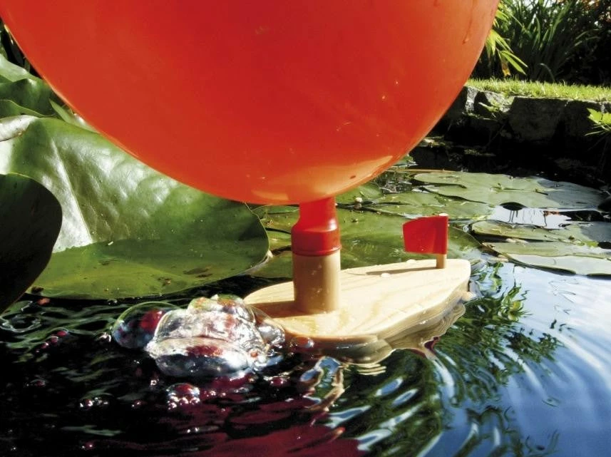 Knatterboot Als Antrieb dient ein aufgeblasener Luftballon. Durch die entweichende Luft wird das Boot vorwärts bewegt. Durch die Holzröhrchen gleitet die Luft und entweicht unterhalb der Wasseroberfläche. Und nun Leinen los, die Bootsfahrt kann beginnen. 1 Luftballon Holzboot mit Fahne. #Material: lackiertes Fichtenholz. Maße: 15 x 7 cm. Empfehlung: ab 3 Jahren (unter 3 Jahre nicht geeignet)